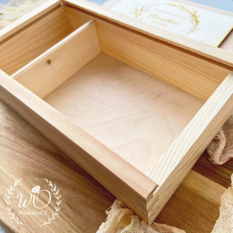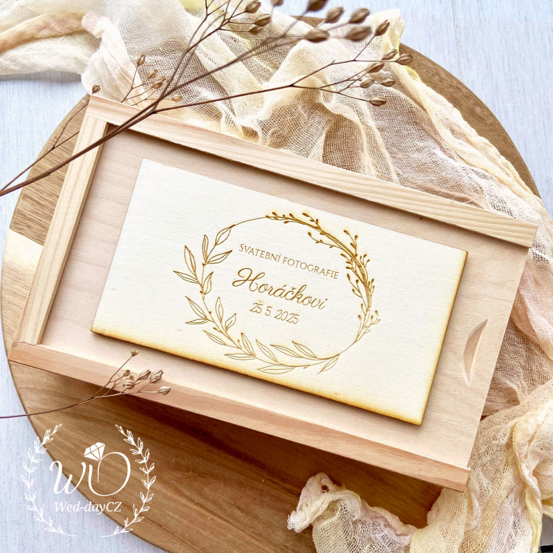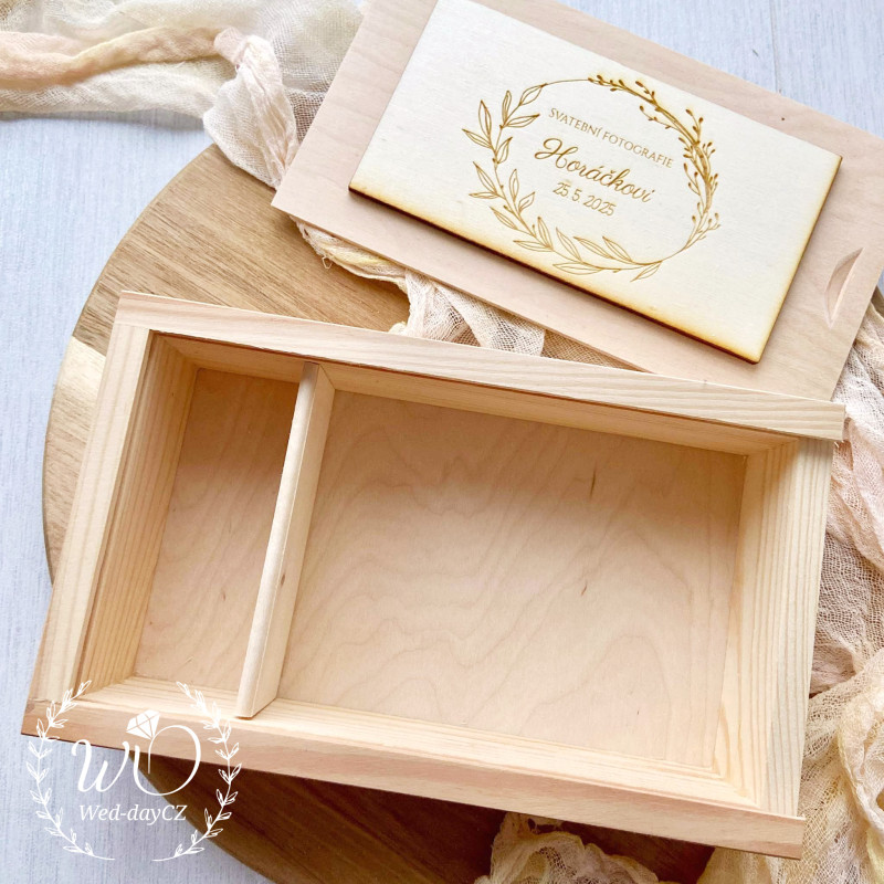 Vysouvací dřevěná krabička s Vašimi údaji, s přihrádkami na svatební fotografie 9 x 13 cm a USB flesh disk.