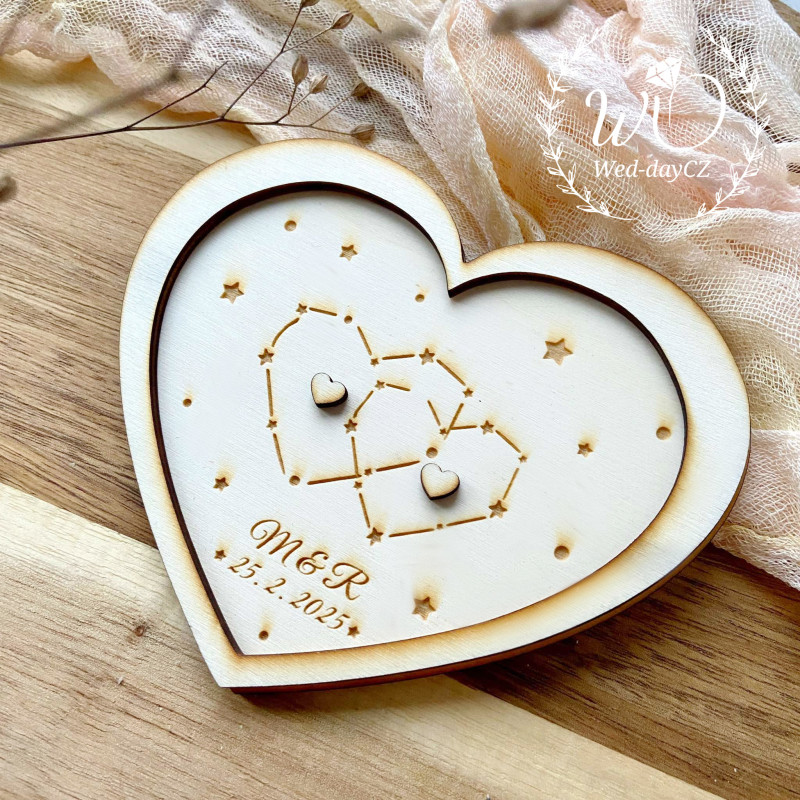 Dřevěný podnos na snubní prstýnky s jemným motivem souhvězdí symbolizuje vaši lásku směřující až ke hvězdám.
