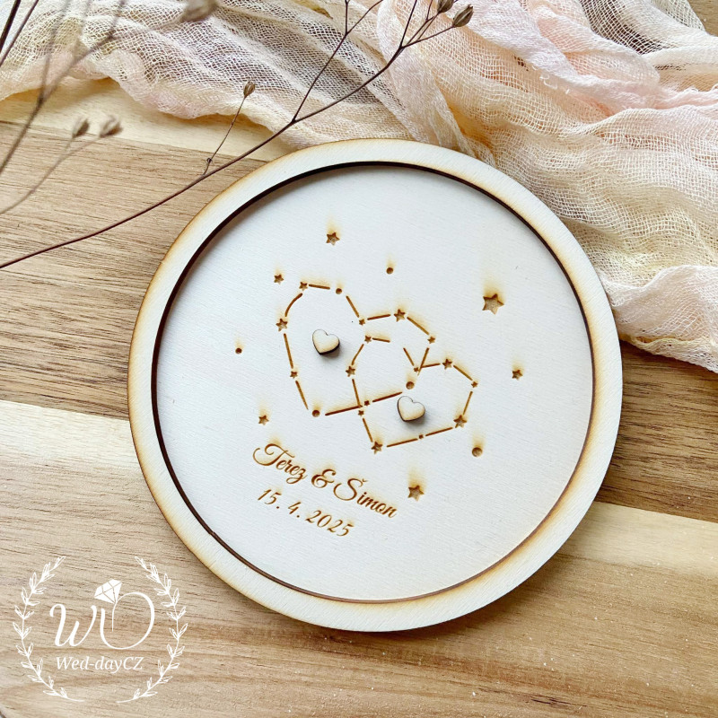 Dřevěný podnos na snubní prstýnky s jemným motivem souhvězdí symbolizuje vaši lásku směřující až ke hvězdám.